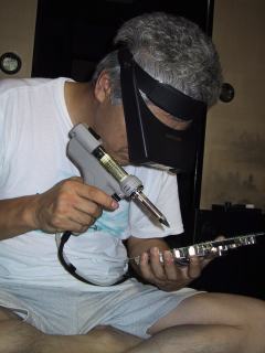 OMもちょっとお年を召して細かい配線が見難くなりました。(老眼?) つけているのはそのOMの秘密兵器!!!です。 これがあればどんなに細いパターンでも大丈夫ですね。(笑) |