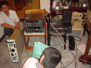 後ろに見えるのがJA9BBB長谷川 OMです。 左の受信機は手前後姿のJF2SVU奥村OMが持ち込んだRACAL社の受信機です。 |