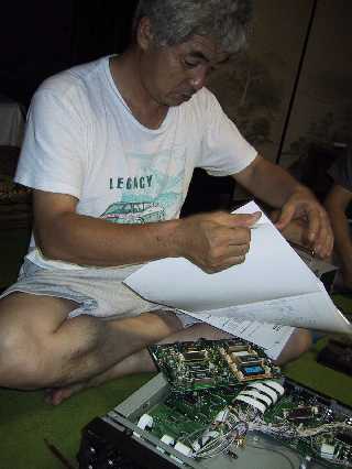 | 早速JN1DNG川村さんによるMark−Vの改造です。 すでにMark−Vをばらばらにして図面を目で追う川村OM。 川村OM期待してますよ!!。 |