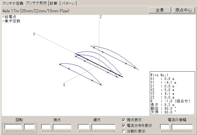 | アンテナの形状と各エレメントの電流分布の様子です。 |